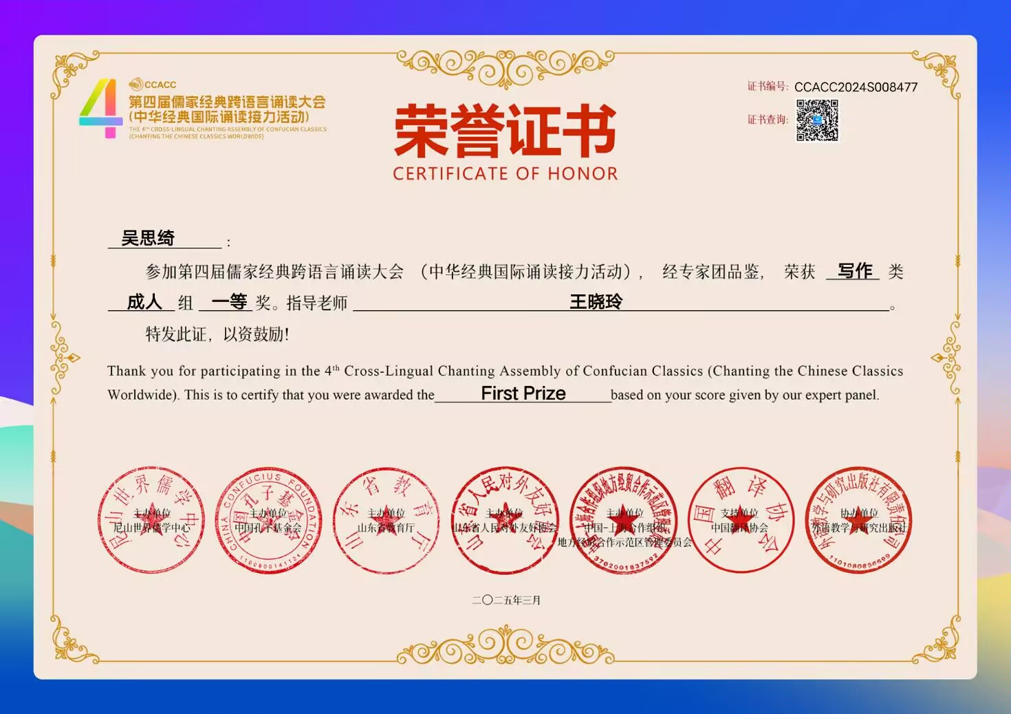 文化交融,搭建语言交流桥梁。在第四届儒家经典跨语言诵读大会中,yl7703永利集团学生斩获佳绩。学院组织专业教师对学生进行系统的指导,从语言表达、文化内涵阐释以及诵读情感把握等多个方面给予针对性辅导。通过此次活动,学生们不仅在语言学习上取得了进步,更通过外语这一桥梁,进一步拓展了文化传播新路径,为弘扬中华优秀传统文化,促进文化交流互鉴贡献了积极力量。
