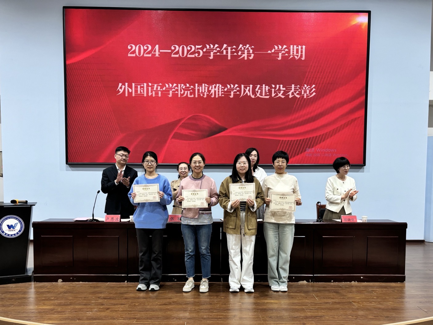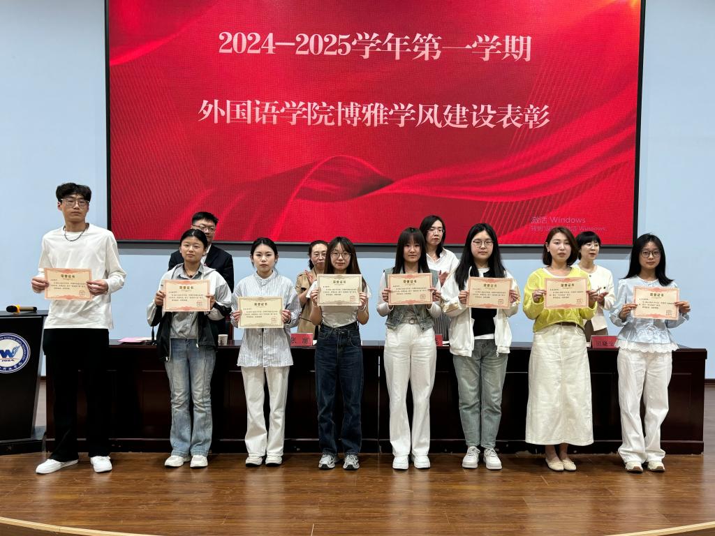最后,学院党总支书记张丽对上学期的学风建设成果进行了总结和表扬,她强调了学风建设对学生成长和院系发展的重要性,并对全院师生提出三点要求:一、高度重视学风建设。学风是读书之风,是治学之风,更是做人之风。只有抓好学风建设,才是培养高质量人才的保证。二、重视学风建设的内涵。学风是学生从学校所带走的能影响一生的特殊气质。学风建设归根到底要立足于学生、见效于学生。要形成尊师重教、严谨求实的院风、教风,营造环境育人的班风、室风、舍风,培养严肃有序、诚实守信的考风等。三、持续做好学风建设。培养学生具备广博的知识和雅正的品格,提升学生外语能力和跨文化交际能力,讲好中国故事,传播好中国声音。