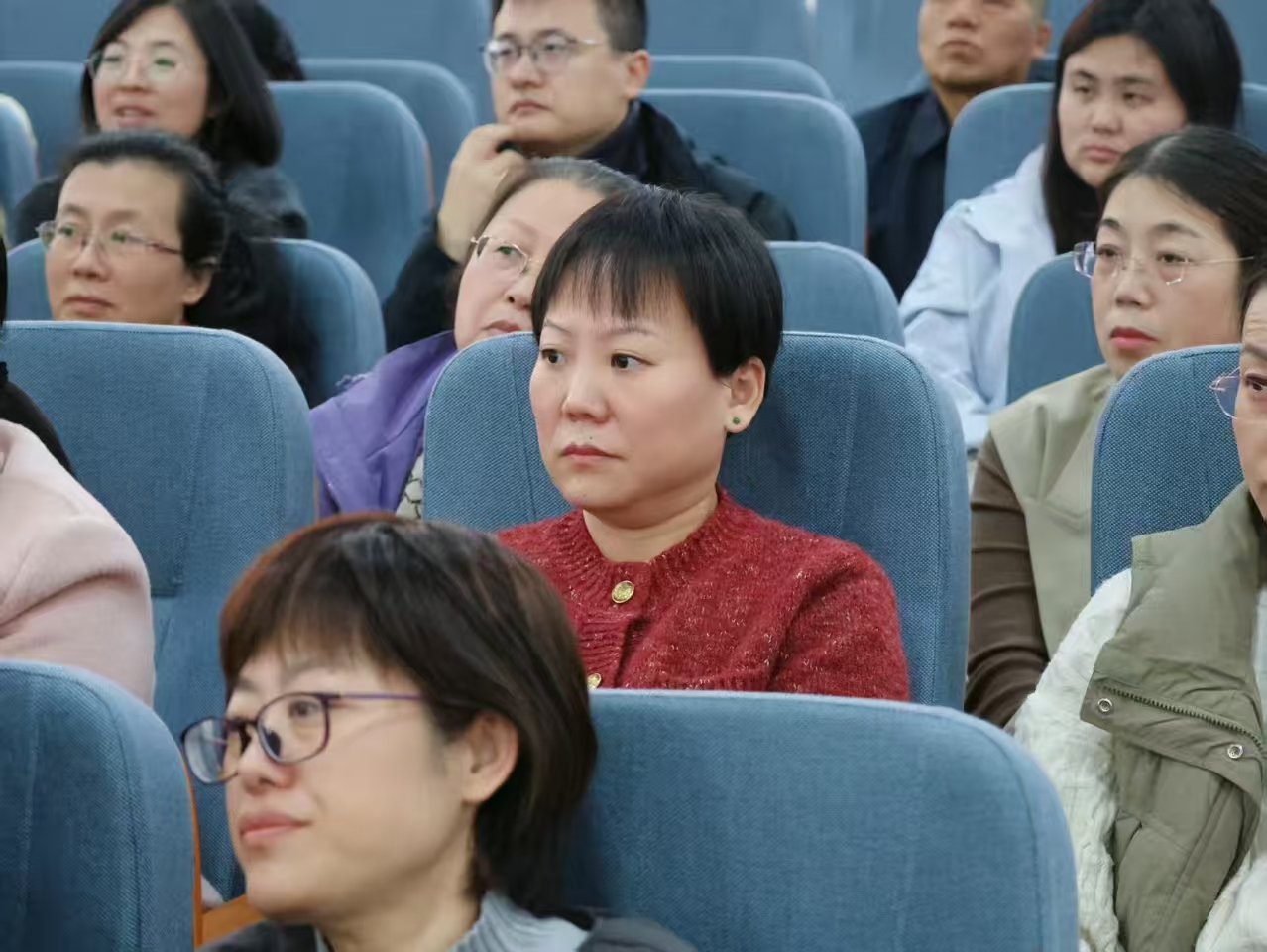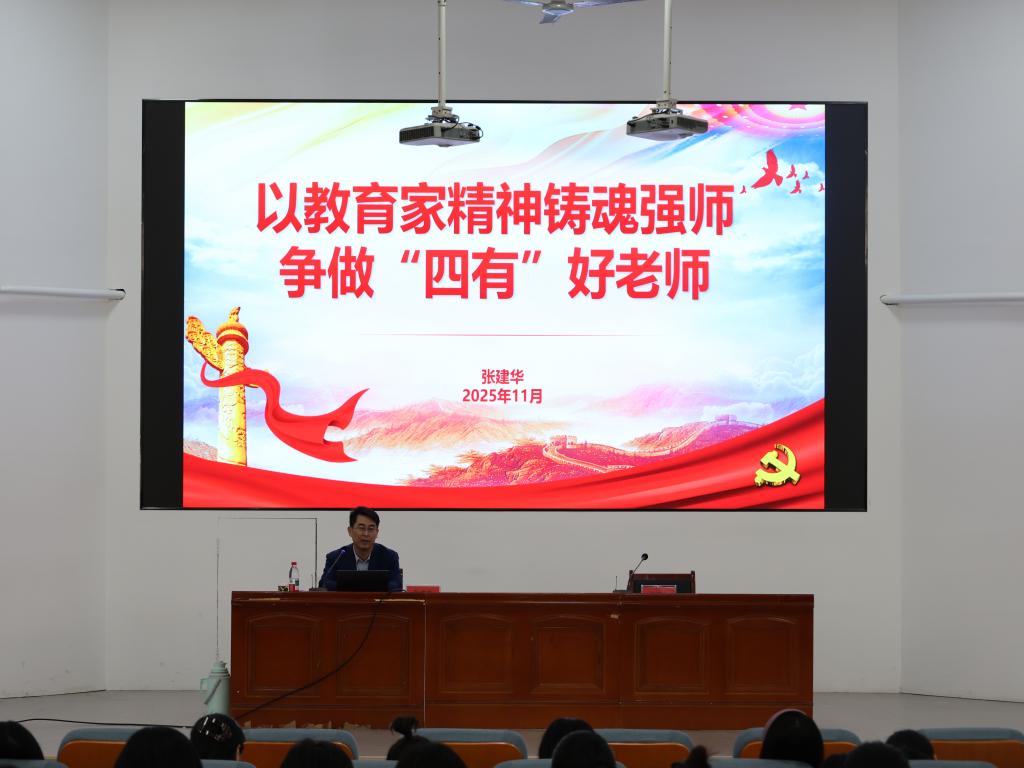 张建华详细讲解了“四有”好老师的素养体系:理想信念为方向、道德情操为基础、扎实学识为支撑、仁爱之心为底色。他结合张桂梅、陈立群等优秀教师事迹,生动阐释了“四有”标准在教书育人中的实践体现,并提出四条培育路径:以信仰洗礼坚定理想信念,以文化浸润陶冶道德情操,以专业淬炼涵养扎实学识,以实践体悟勤修仁爱之心,强调教师需通过持续学习实践将标准内化于心、外化于行。张建华还解读了学校师德师风建设系列规章制度,要求全体教师筑牢思想防线、恪守职业底线。
