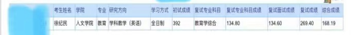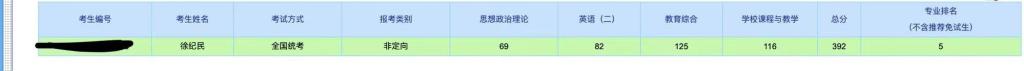 报考专业为教育专硕(学科英语方向)。初试成绩392分,其中政治69分,英语82分,专业课一125分,专业课二116分,排名第5名,复试综合排名第2名,成功上岸江南大学(国家“211工程”重点建设高校和国家“双一流”建设高校)。