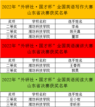 近日,由外语教学与研究出版社和中国外语与教育研究中心联合主办、北京外研在线数字科技有限公司和中国外语测评中心联合承办的2022年“外研社·国才杯”全国英语写作大赛、阅读大赛和演讲大赛山东省决赛顺利落下帷幕,我校学生喜获二等奖3项,三等奖4项。