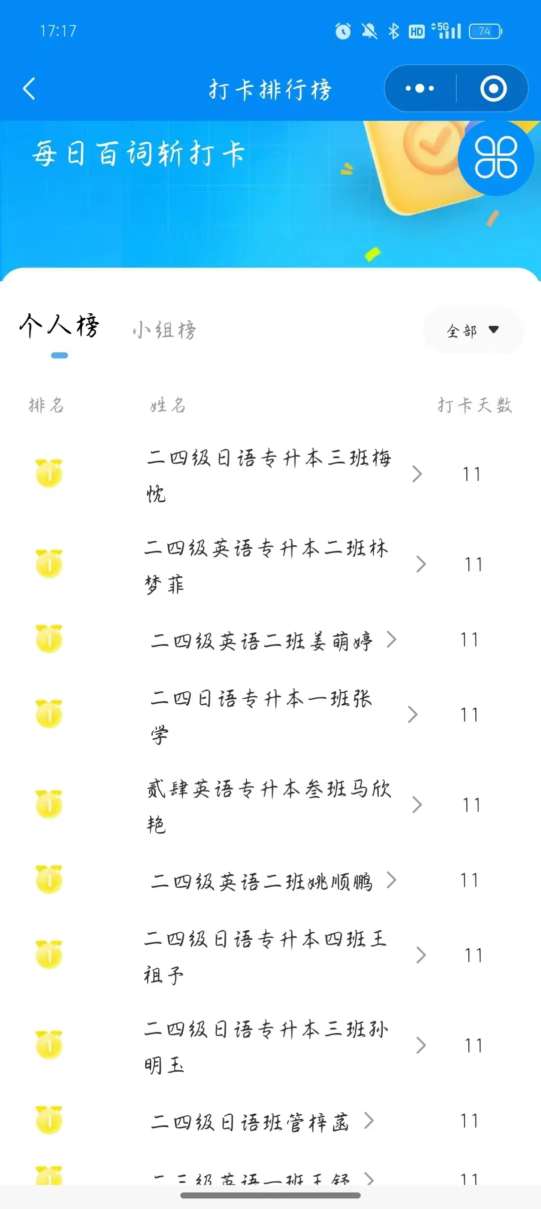 为推动学院学风建设,营造浓厚的学习氛围,帮助学生养成良好的学习习惯,提升词汇量,为英语学习打下坚实基础,yl7703永利集团于近期举办了百词斩打卡活动,我院学子积极参加,近十天以来,活动成果显著。