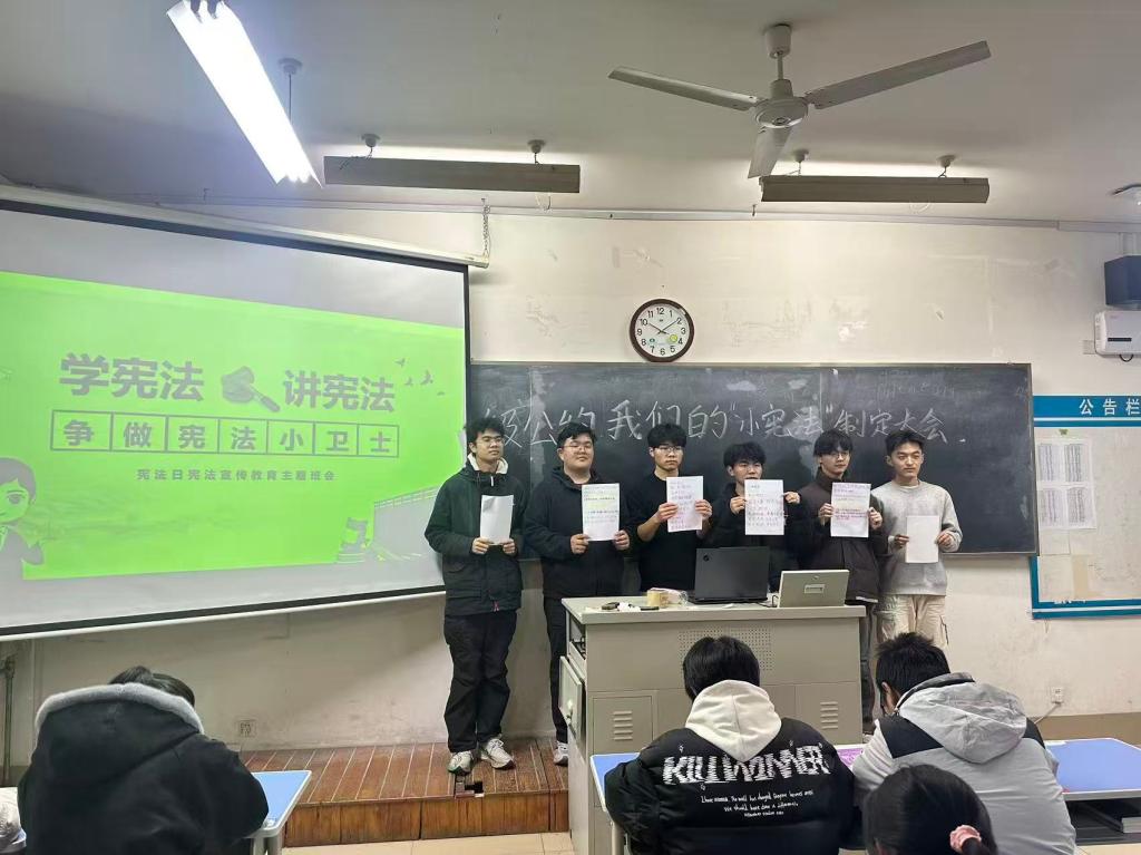 各班级率先开展“普法同行,法治护航”主题宣讲,同学们结合身边真实案例,通俗解读宪法核心条款、权利义务等实用知识,搭配案例分析与要点梳理,让抽象法治知识走进日常。学院同步举办“以赛弘宪,以知践法”知识竞赛,设置单选、案例分析等多样题型,分初答、抢答环节,同学们在竞技比拼中巩固知识、深化理解。