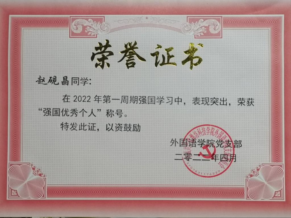 将目标放在远方,将困难踩在脚下,不断重复,直至超越。身为一名学生,赵砚晶始终将学习视作大学的第一要务,并坚持将所学应用到实践当中。她深知在语言学习过程中的艰辛与枯燥,但是就算在专业学习上步伐缓慢,也要一直一直一点一点变好。在这过程中她不断和效率低的自己和解,不断和耐不下心的自己和解,探索着专属于自己的节奏。在课本中学习表达,在ppt中提炼重点,在笔记中形成体系。“将知识落实到纸上,变得有逻辑,成体系是一件非常愉悦的事。”